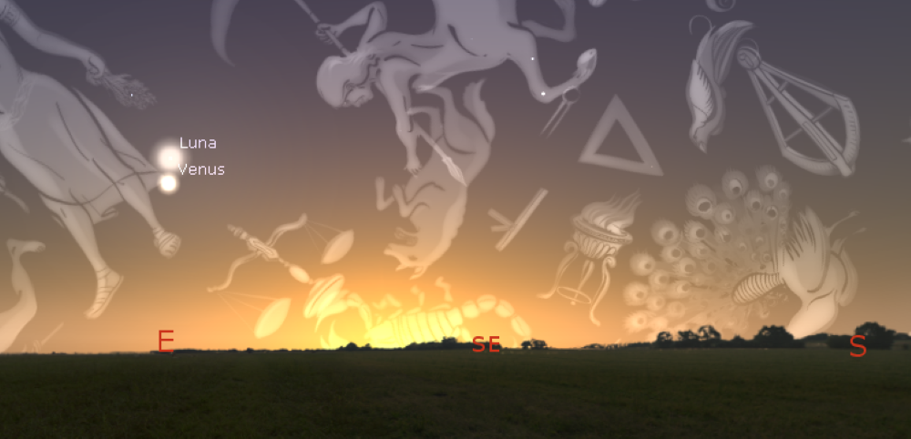 La Luna y Venus se encontrarán en conjunción compartiendo la misma ascensión recta (coordenada del sistema ecuatorial que se utiliza para localizar astros en el cielo) con la Luna pasará 3°38′ al sur de Venus. (referencia: el ancho del dedo meñique equivale a 1º de arco, y 1º = 60’ de arco).