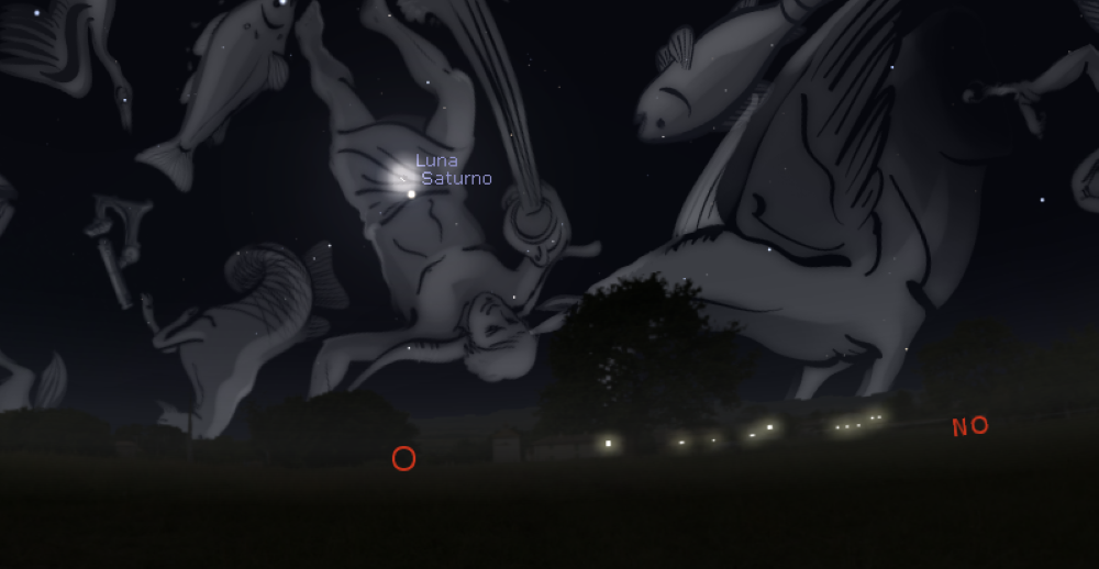 La Luna y Saturno se encontrarán en conjunción compartiendo la misma ascensión recta (coordenada del sistema ecuatorial que se utiliza para localizar astros en el cielo) con la Luna pasando a 2°28′ al sur de Saturno.
