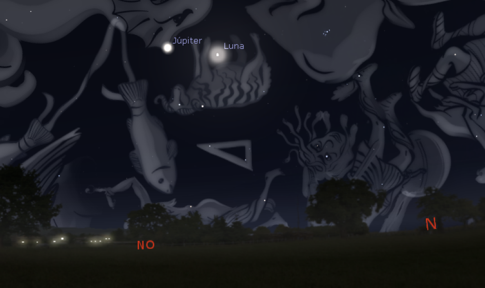 La Luna y Júpiter se encontrarán en conjunción compartiendo la misma ascensión recta (coordenada del sistema ecuatorial que se utiliza para localizar astros en el cielo) con la Luna pasando a 2°36′ al norte de Júpiter.