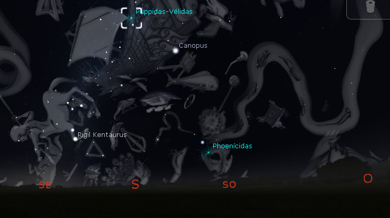 Posición del radiante de la lluvia de meteoros Púppidas-Vélidas el día 7 a las 04:30.