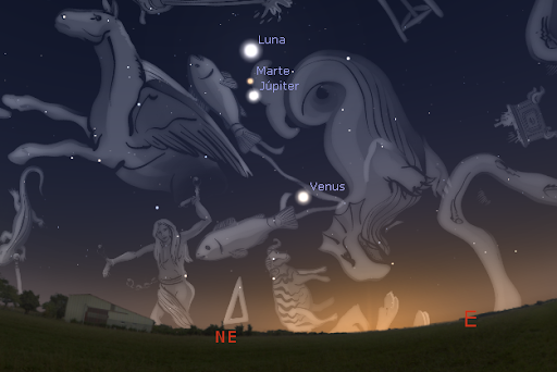 Júpiter y Marte se encontrarán en conjunción, compartiendo la misma ascensión recta (coordenada del sistema ecuatorial que se utiliza para localizar astros en el cielo), con Júpiter pasando 0°38′ al norte de Marte.