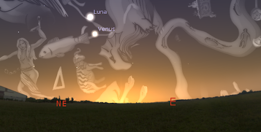 La Luna y Venus compartirán la misma ascensión recta (coordenada del sistema ecuatorial que se utiliza para localizar astros en el cielo), con la Luna pasando 0°12′ al sur de Venus.