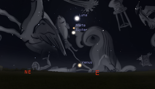 Desde Córdoba, la pareja, ambos ubicados en la constelación de Piscis, será visible en el cielo del amanecer, ascendiendo a las 03:15 horas y alcanzando una altitud de 51° sobre el horizonte nororiental antes de desaparecer de la vista al amanecer alrededor de las 07:44 horas.