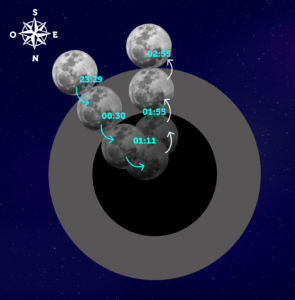 La Luna atravesará la sombra de la Tierra entre las 23:28 horas y las 02:55 horas, creando un eclipse de luna total. El eclipse será visible en cualquier lugar donde la Luna esté sobre el horizonte en ese momento, incluso desde África, América, Europa y la Polinesia Francesa.