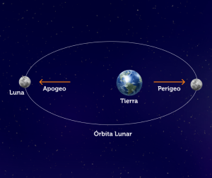 A medida que la Luna recorre esta trayectoria elíptica alrededor de la Tierra cada mes, su distancia varía en ±6,6% de su distancia promedio, que es de 381.600 km, entre 356 500 km cuando la Luna se encuentra en el perigeo, el punto sobre la órbita lunar en que nuestro satélite se encuentra más cercano a la Tierra, y 407.162 km en el apogeo (punto sobre la órbita lunar, en que la luna se encuentra más alejado de la Tierra).
