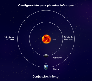 En esta configuración, el planeta se ubica sobre su órbita, entre el Sol y la Tierra de forma tal que si pudiéramos observarlo, lo veríamos aparecer con su tamaño angular más grande, unos 12.2” (segundos de arco) de diámetro, pero dada su posición, desde la Tierra, el planeta nos mostrará su cara no iluminada por lo que será completamente inobservable.