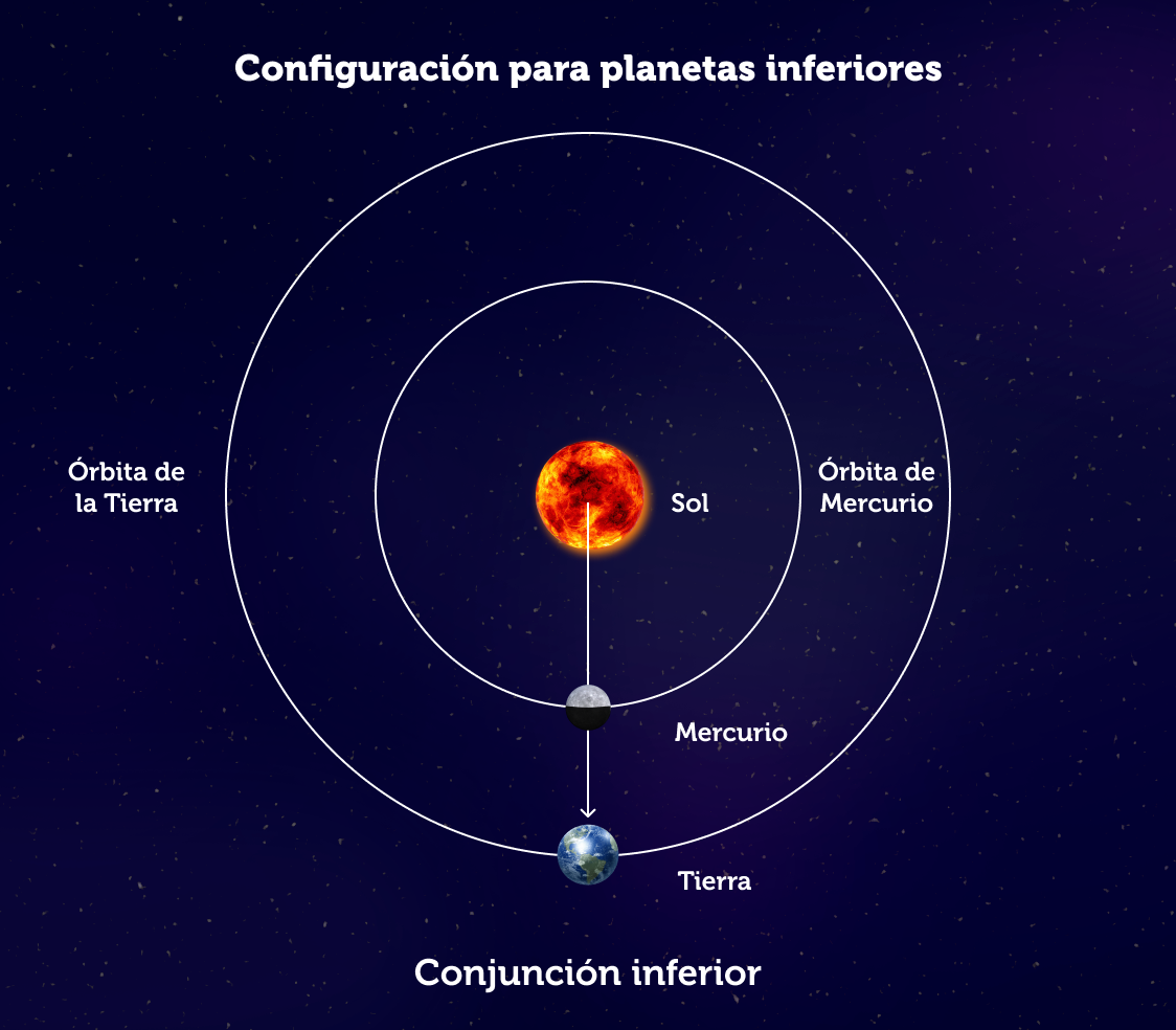 Imagen: En esta ilustración vemos a Mercurio en conjunción solar inferior. Venus, al igual que Mercurio es otro planeta inferior por lo que la configuración entre éste último planeta, el Sol y la Tierra es similar. La ilustración no se encuentra a escala.