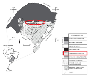 (Imagen 1) Ubicación de la Formación Santa María en el estado de Río Grande do Sul en Brasil. Tomado y modificado de Rodrigues Andrade da Silva et al. 2006.