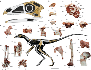 (Imagen 3) Anatomía esquelética de Venetoraptor gassenae. En las reconstrucciones del cráneo y del esqueleto en marrón se representan los huesos preservados mientras que en blanco/gris se visualizan los huesos reconstruidos. Tomado de Müller et al. 2023