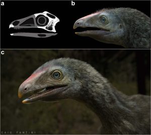 (Imagen 4) Reconstrucción del cráneo y de la cabeza de Venetoraptor gassenae. a. Reconstrucción del cráneo donde se muestra en blanco los huesos encontrados y en gris los elementos reconstruidos. b.c. Reconstrucción del animal en vida donde se observa el pico raptorial y la ranfoteca. Tomado de Müller et al. 2023