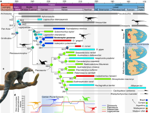 (Imagen 6) Resultados del análisis filogenético y biogeográfico. a. Filogenia de Venetoraptor gassenae mostrando sus relaciones de parentesco con otros lagerpétidos, con pterosaurios y con otros ornitodiros. En la parte superior se halla una escala temporal calibrada con la filogenia que muestra el biocrón de cada taxón. b. Distribución de los lagerpétidos durante el Triásico tardío (las flechas indican eventos de dispersión). c. Reconstrucción de Venetoraptor en vida. Tomado de Müller et al. 2023